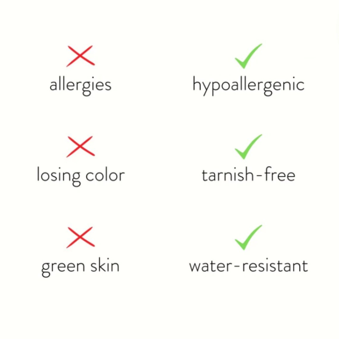 Waterproof. Sweatproof. Tarnish-free: Made from high-grade materials designed to withstand water, heat, lotions, perfumes, and daily wear — without discoloration.
